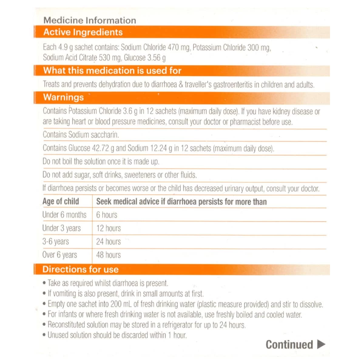 Contains potassium chloride, 3.6g in 12 sachets (maximum daily dose) if you have kidney disease or are taking heart or blood pressure medicines please consult your doctor or pharmacist before use. Contains glucose 42.72g and sodium 12.24g in 12 sachets (maximum daily dose). Contains sodium saccharin.