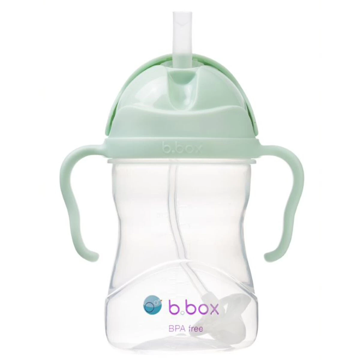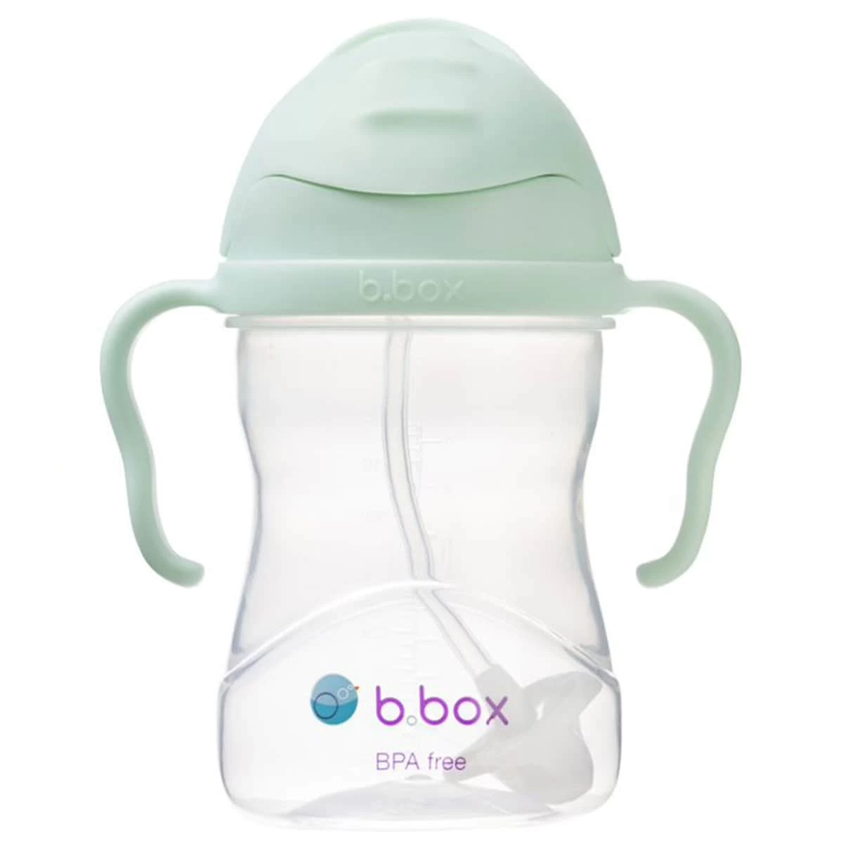 The cup has a weighted straw that moves with the liquid no matter the angle. It has a 2 way valve, is leak proof even with warm water and has a simple flip top lid. The b.box sippy cup encourages independence with its easy-grip handles.