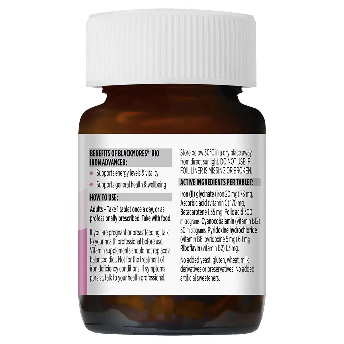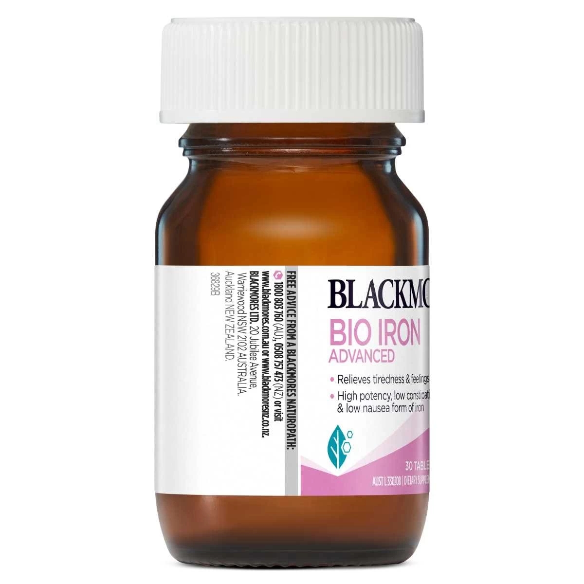 Blackmores Bio Iron Advanced formula contains iron bisglycinate which is better absorbed than some other forms of iron, such as ferrous sulphate, if taken with food.