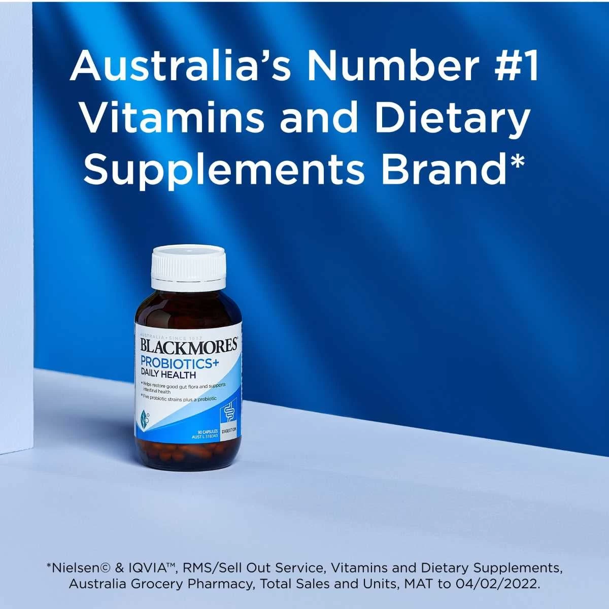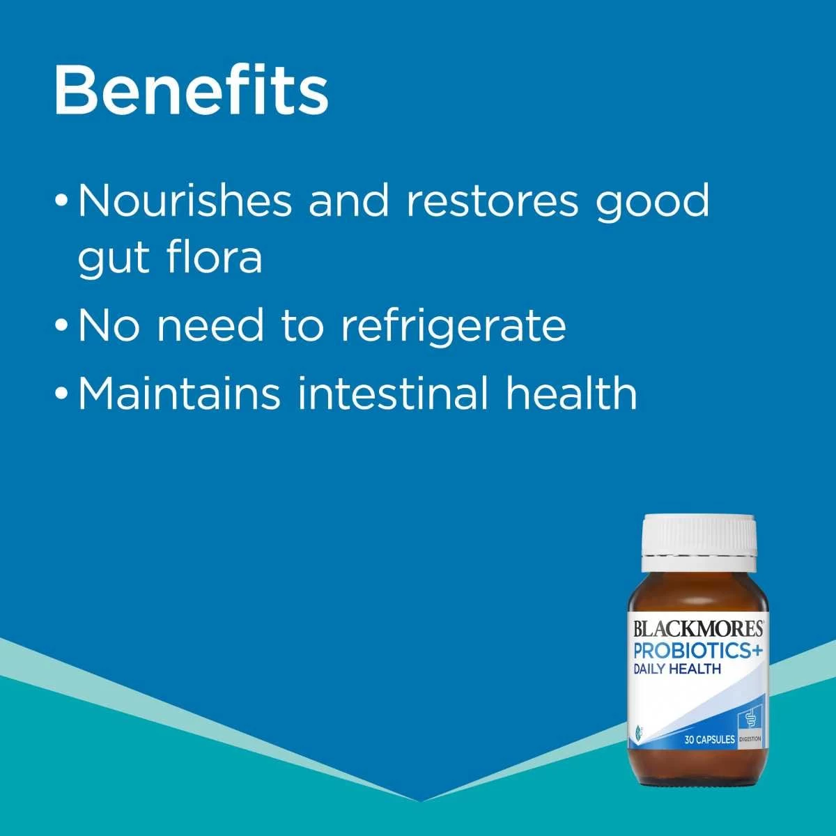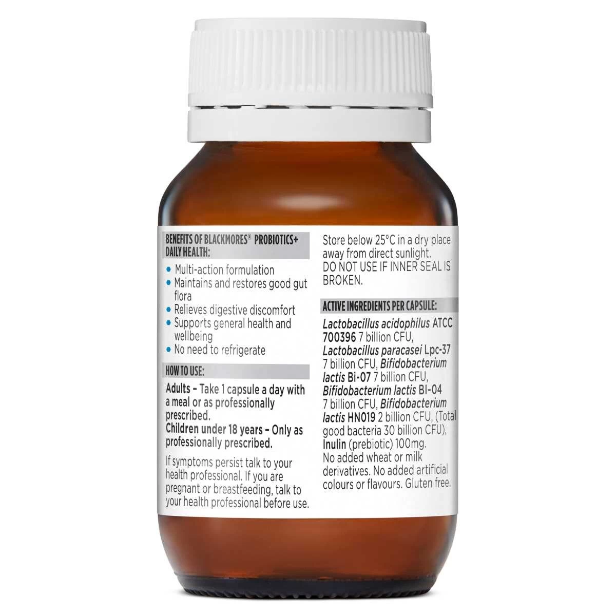 Support your gut health with Blackmores Probiotics+ Daily Health capsules. This product combines a daily probiotic formula with a prebiotic to maintain your intestinal health and relieve digestive discomfort. This dualaction formula contains five clinically trialled* probiotic strains providing 30 billion good bacteria. There’s no need to refrigerate – a specialised formulation process and packaging technology help prevent moisture from harming the good bacteria, helping keep them alive. Adults: Take one capsule per day to nourish good intestinal flora and support your intestinal health