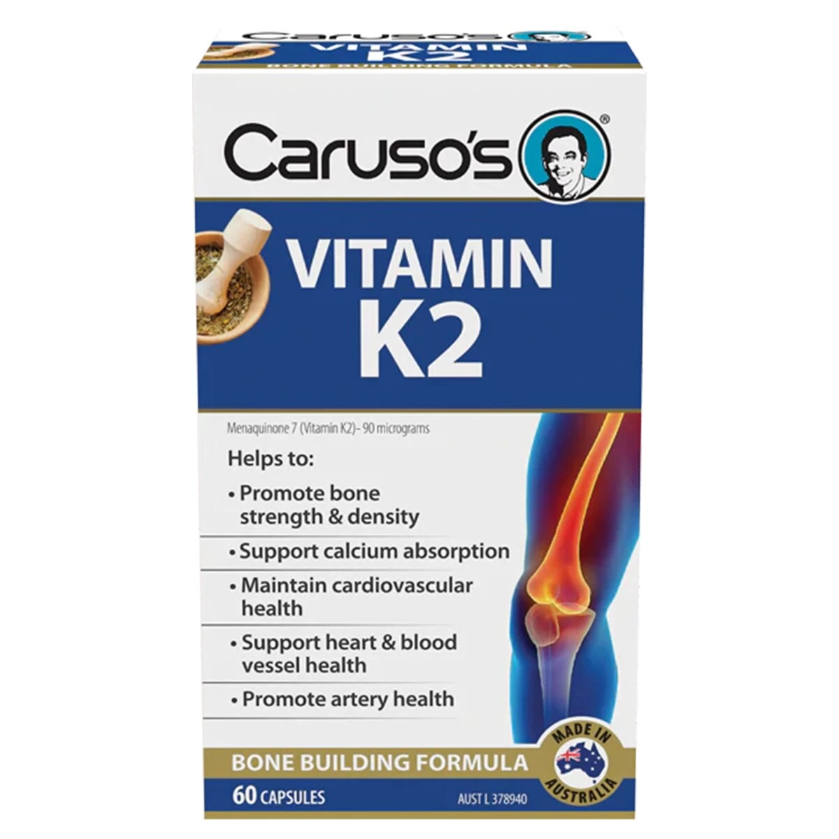 Caruso’s Vitamin K2 contains the bioavailable Menaquinone 7 which supports the maintenance of healthy bones and cardiovascular system functions. Vitamin K2 helps to support bone mineralisation including calcium absorption and metabolism in the bones.