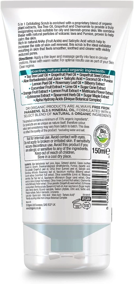5 in 1 Exfoliating Scrub is enriched with a proprietary blend of organic plant extracts, Tea Tree Oil, Grapefruit and Chamomile to provide a truly invigorating scrub suitable for oily and blemish-prone skin. We combine these with natural particles of volcanic lava and Pumice, proven to help calm the skin. Rich in natural AHAs (Fruit Acids) and Salicylic Acid which help to increase the rate of skin cell renewal, this scrub is the ideal exfoliator resulting in skin that feels smoother, soothed and clearer with visibly reduced pores.
