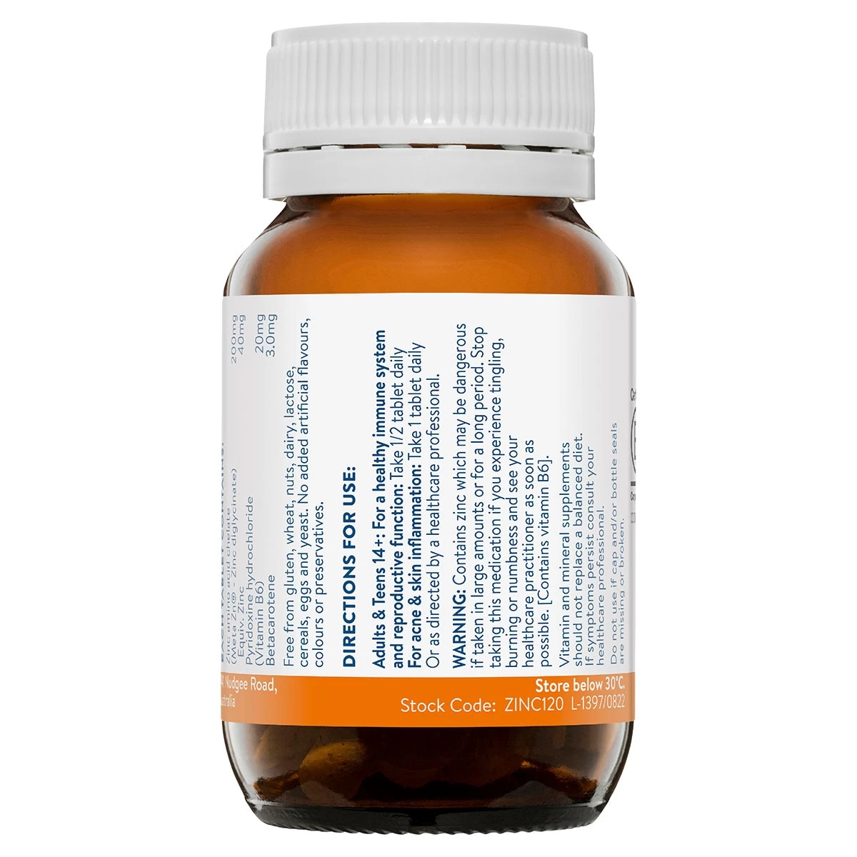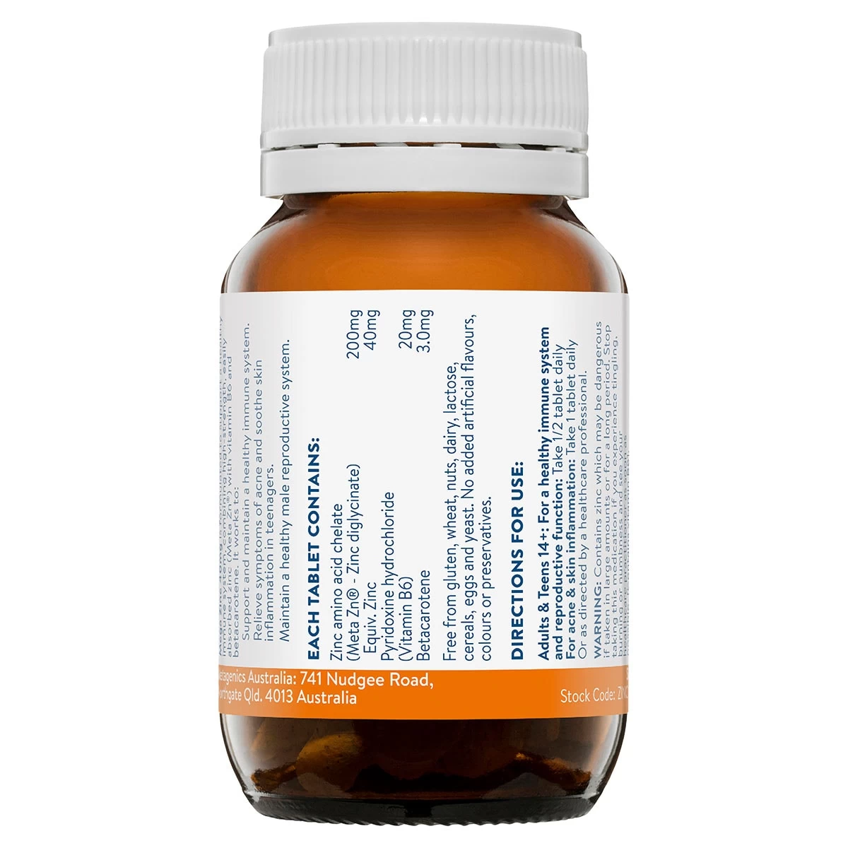 Zinc amino acid chelate (Meta Zn® – Zinc diglycinate) 200mg Equiv. elemental Zinc 40mg Pyridoxine hydrochloride (Vitamin B6) 20mg Betacarotene 3mg