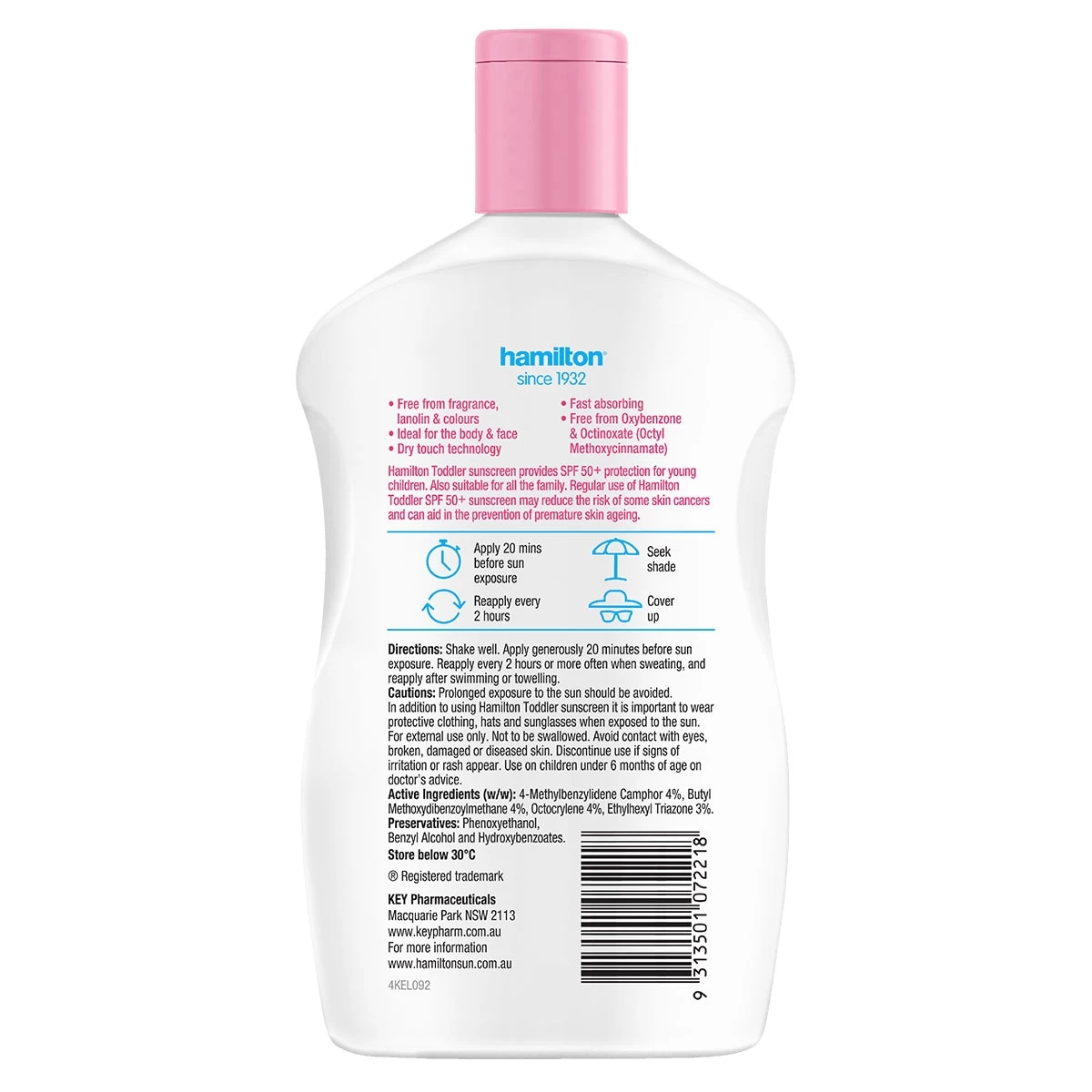 Hamilton Sunscreen Toddler Lotion SPF 50, provides high UVA/UVB protection & is water resistant for up to 4 hours. For face & body, fragrance, lanolin & colour free.