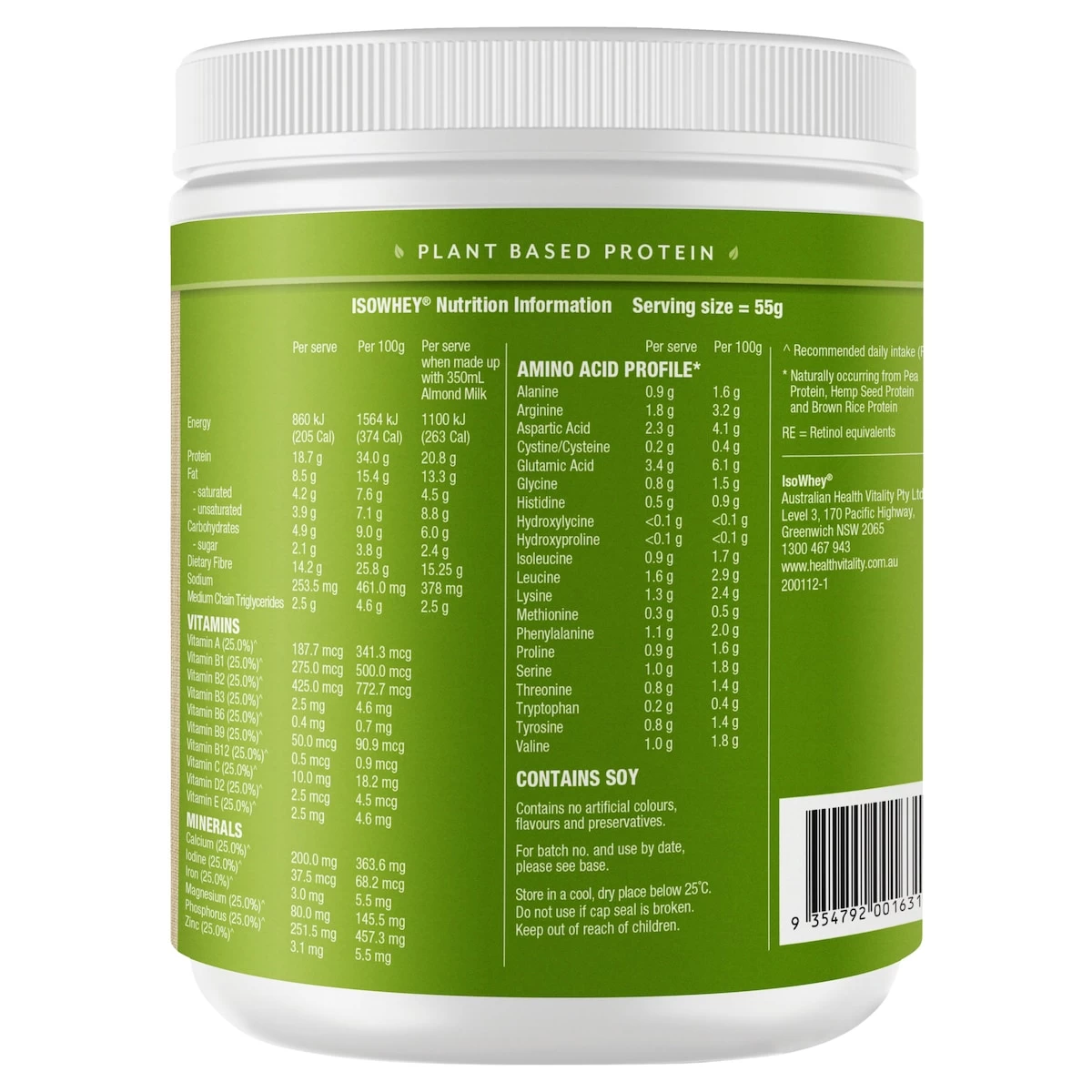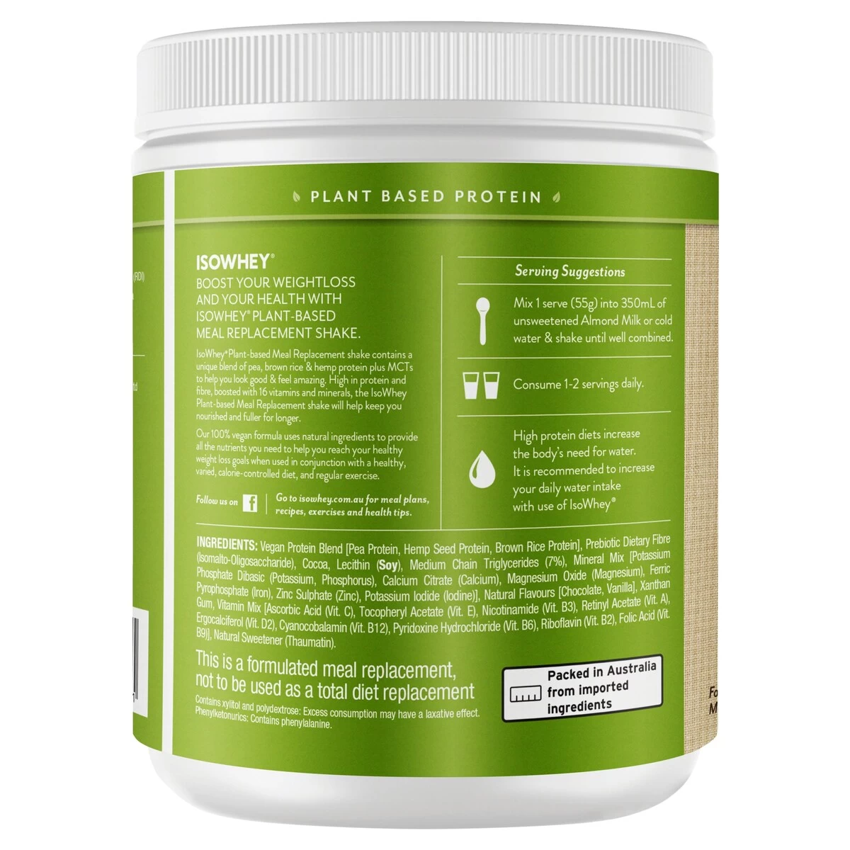 Vegan Protein Blend [Pea Protein, Hemp Seed Protein, Brown Rice Protein], Prebiotic Dietary Fibre (Isomalto-Oligosaccharide), Cocoa, Lecithin (Soy), Medium Chain Triglycerides (7%), Mineral Mix [Potassium Phosphate Dibasic (Potassium, Phosphorus), Calcium Citrate (Calcium), Magnesium Oxide (Magnesium), Ferric Pyrophosphate (Iron), Zinc Sulphate (Zinc), Potassium Iodide (Iodine)], Natural Flavours [Chocolate, Vanilla], Xanthan Gum, Vitamin Mix [Ascorbic Acid (Vit. C), Tocopheryl Acetate (Vit. E), Nicotinamide (Vit. B3), Retinyl Acetate (Vit. A), Ergocalciferol (Vit. D2), Cyanocobalamin (Vit. B12), Pyridoxine Hydrochloride (Vit. B6), Riboflavin (Vit. B2), Folic Acid (Vit. B9)], Natural Sweetener (Thaumatin).