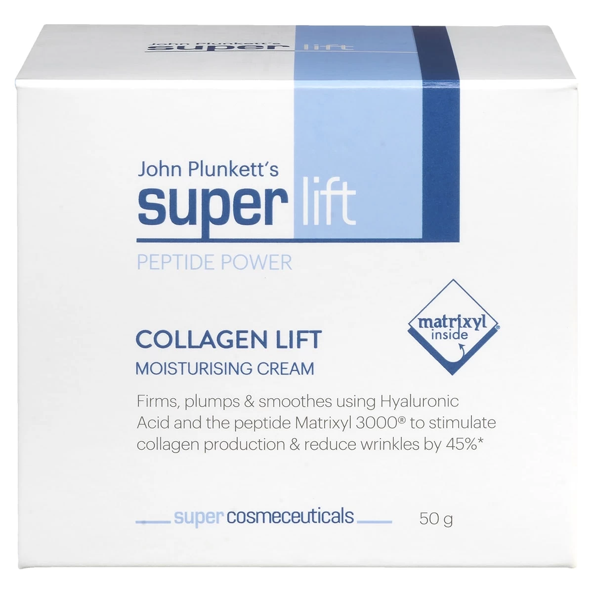John Plunketts SuperLift collagen lift cream, has hyaluronic acid and a clinically proven level of Matrixyl 3000 to help smooth, plump, firm and hydrate your skin.