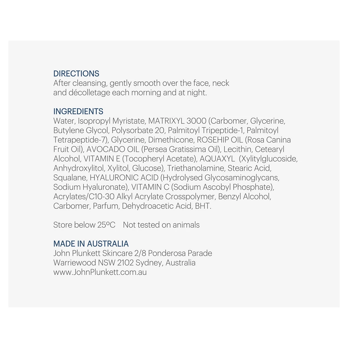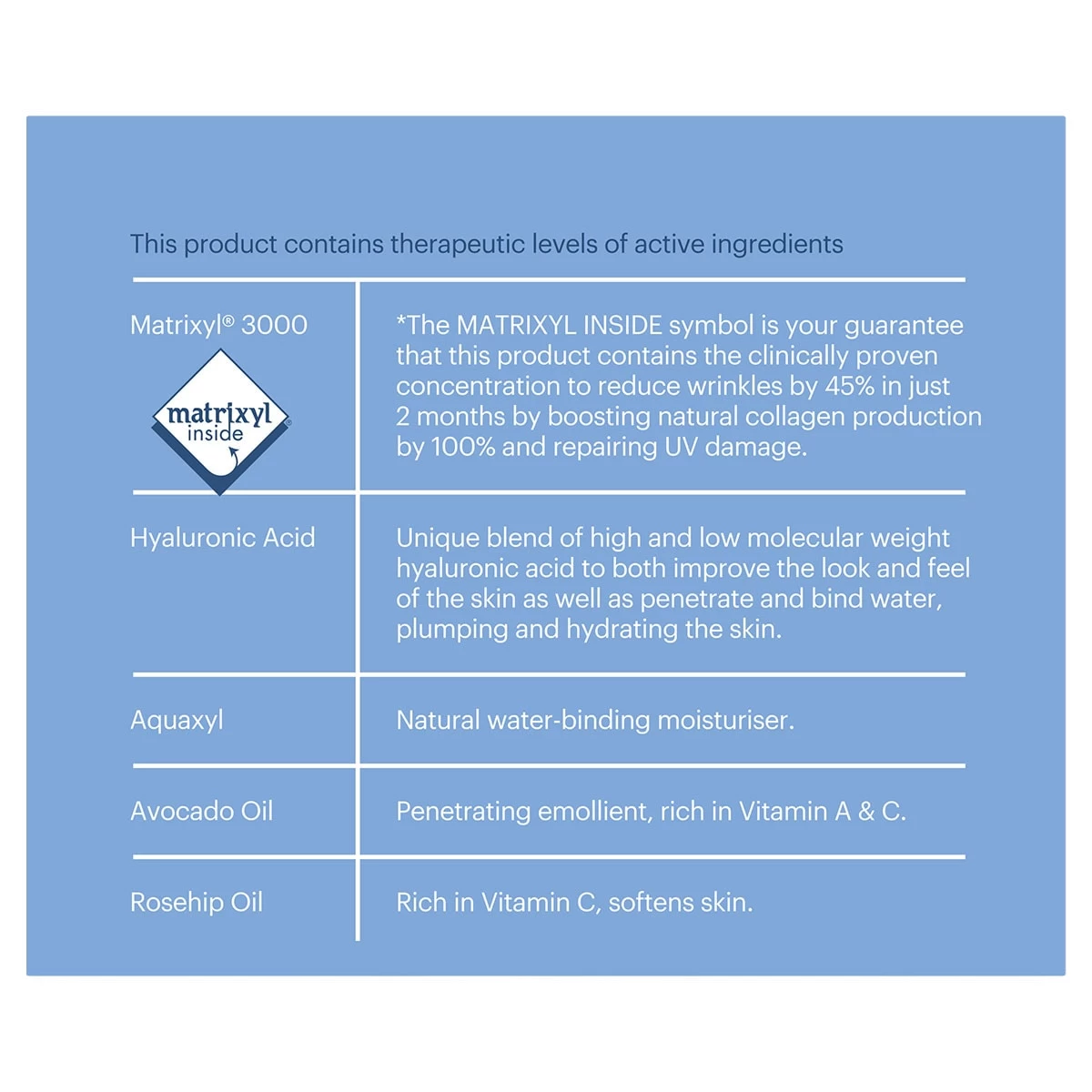 Water, Isopropyl Myristate, MATRIXYL 3000 (Carbomer, Glycerine, Butylene Glycol, Polysorbate 20, Palmitoyl Tripeptide-1, Palmitoyl Tetrapeptide-7), Glycerine, Dimethicone, ROSEHIP OIL (Rosa Canina Fruit Oil), AVOCADO OIL (Persea Gratissima Oil), Lecithin, Cetearyl Alcohol, VITAMIN E (Tocopheryl Acetate), AQUAXYL (Xylitylglucoside, Anhydroxylitol, Xylitol, Glucose), Triethanolamine, Stearic Acid, Squalane, HYALURONIC ACID (Hyaluramine, Sodium Hyaluronate), VITAMIN C (Sodium Ascobyl Phosphate), Acrylates/C10-30 Alkyl Acrylate Crosspolymer, Benzyl Alcohol, Carbomer, Parfum, Dehydroacetic Acid, BHT.
