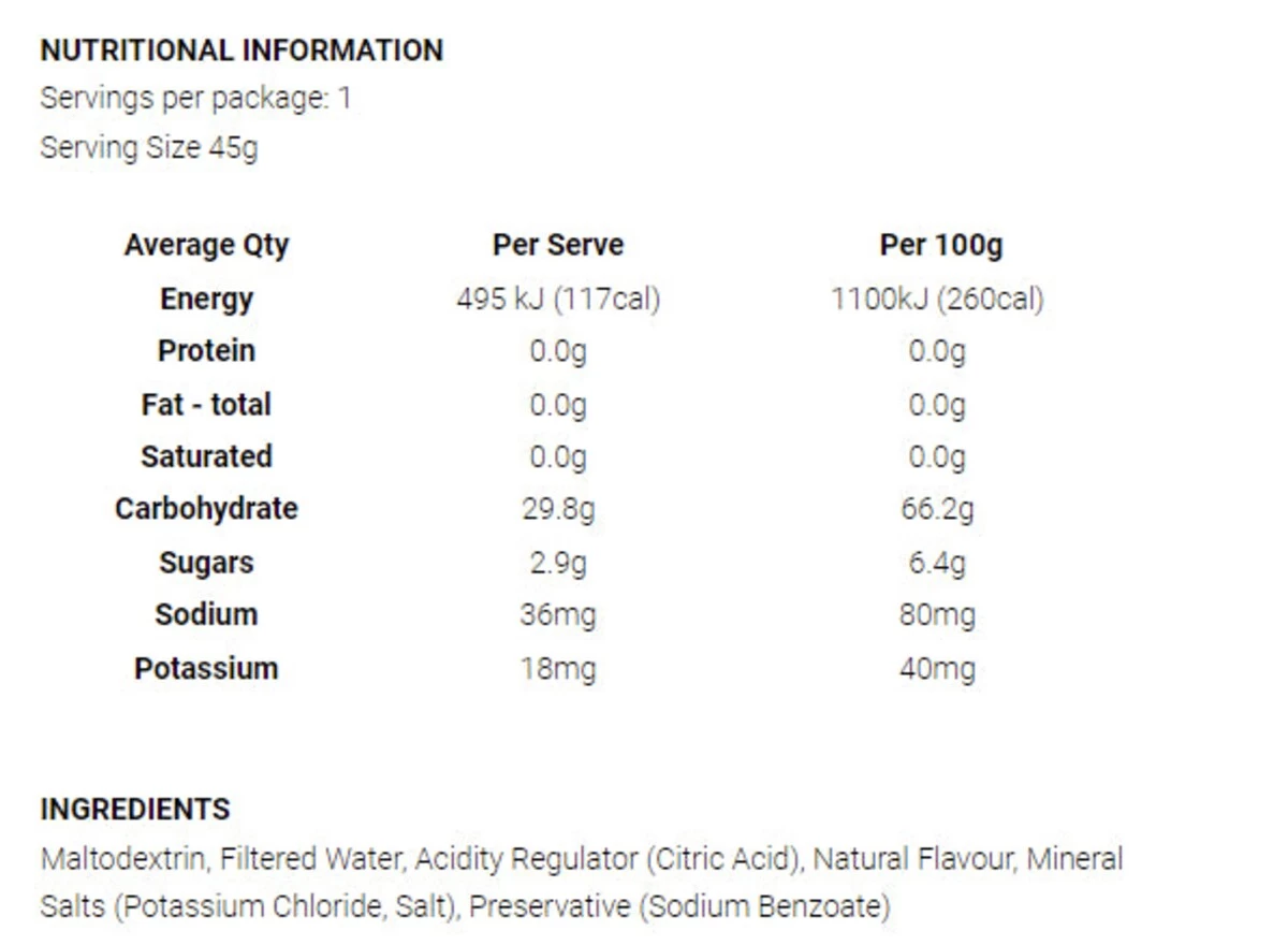 Maltodextrin, Filtered Water, Acidity Regulator (Citric Acid), Natural Flavour, Mineral Salts (Potassium Chloride, Salt), Preservative (Sodium Benzoate)