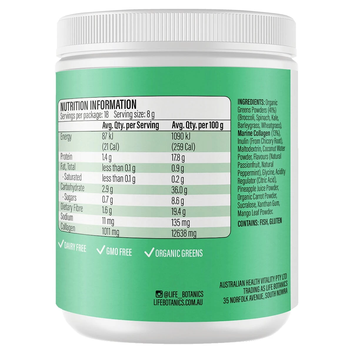 Organic Greens Powders (41%) (Broccoli, Spinach, Kale, Barleygrass, Wheatgrass), Marine Collagen (13%), Inulin (From Chicory Root), Maltodextrin, Coconut Water Powder, Flavours (Natural Passionfruit, Natural Spearmint), Glycine, Acidity Regulator (Citric Acid), Pineapple Juice Powder, Organic Carrot Powder, Sucralose, Xanthan Gum, Mango Leaf Powder