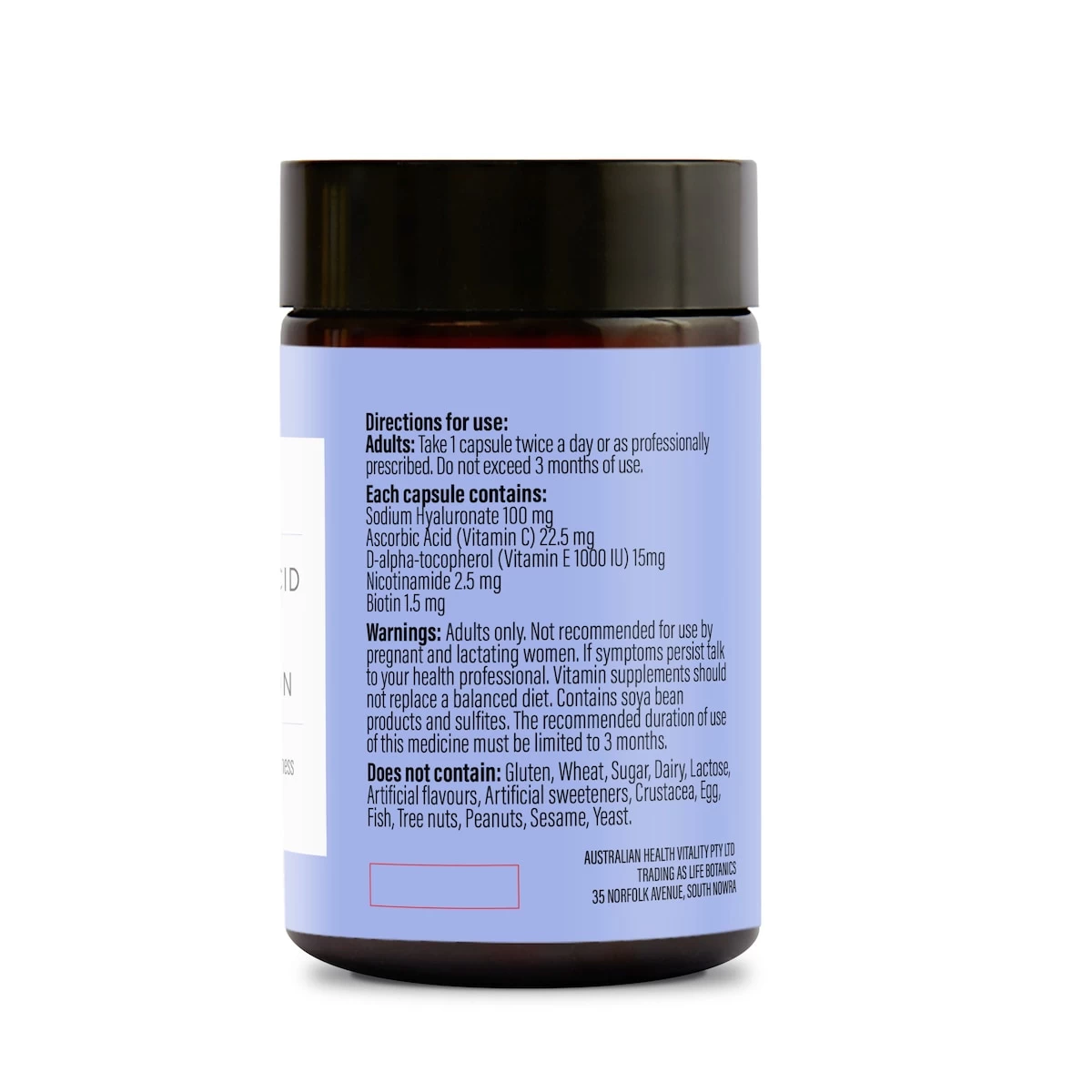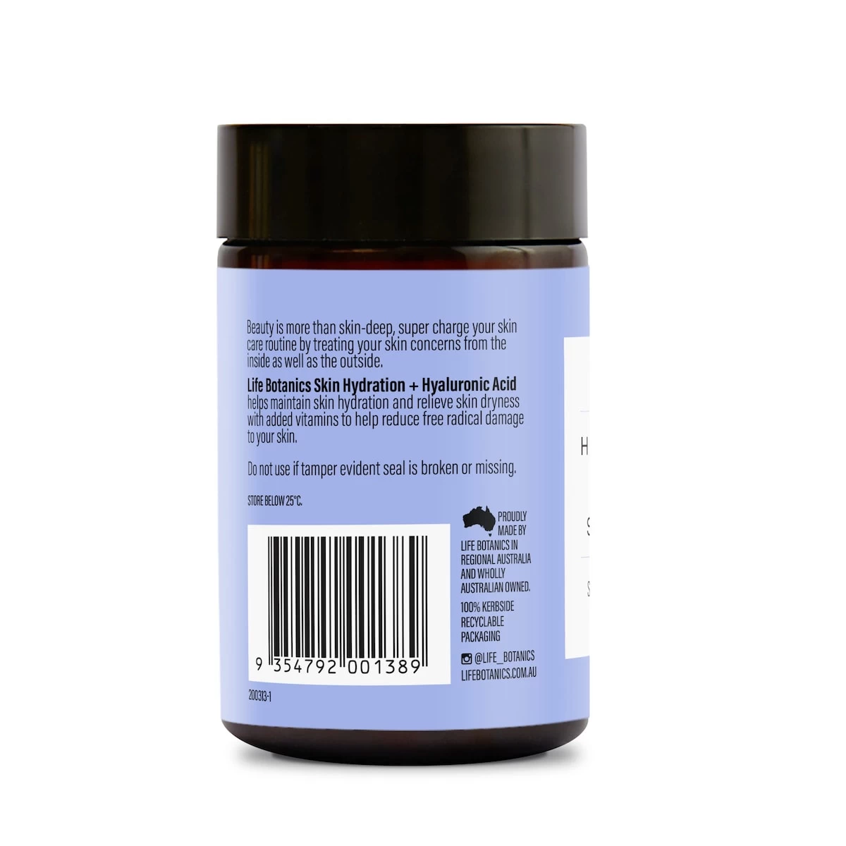 Improve your skin quality and glow from within! Life Botanics Hyaluronic Acid + Skin Hydration supports collagen formation and maintains skin elasticity. It will support skin structure, and skin healing/regeneration.Our packaging is 100% kerbside recyclable, please recycle this packaging after removing the label.