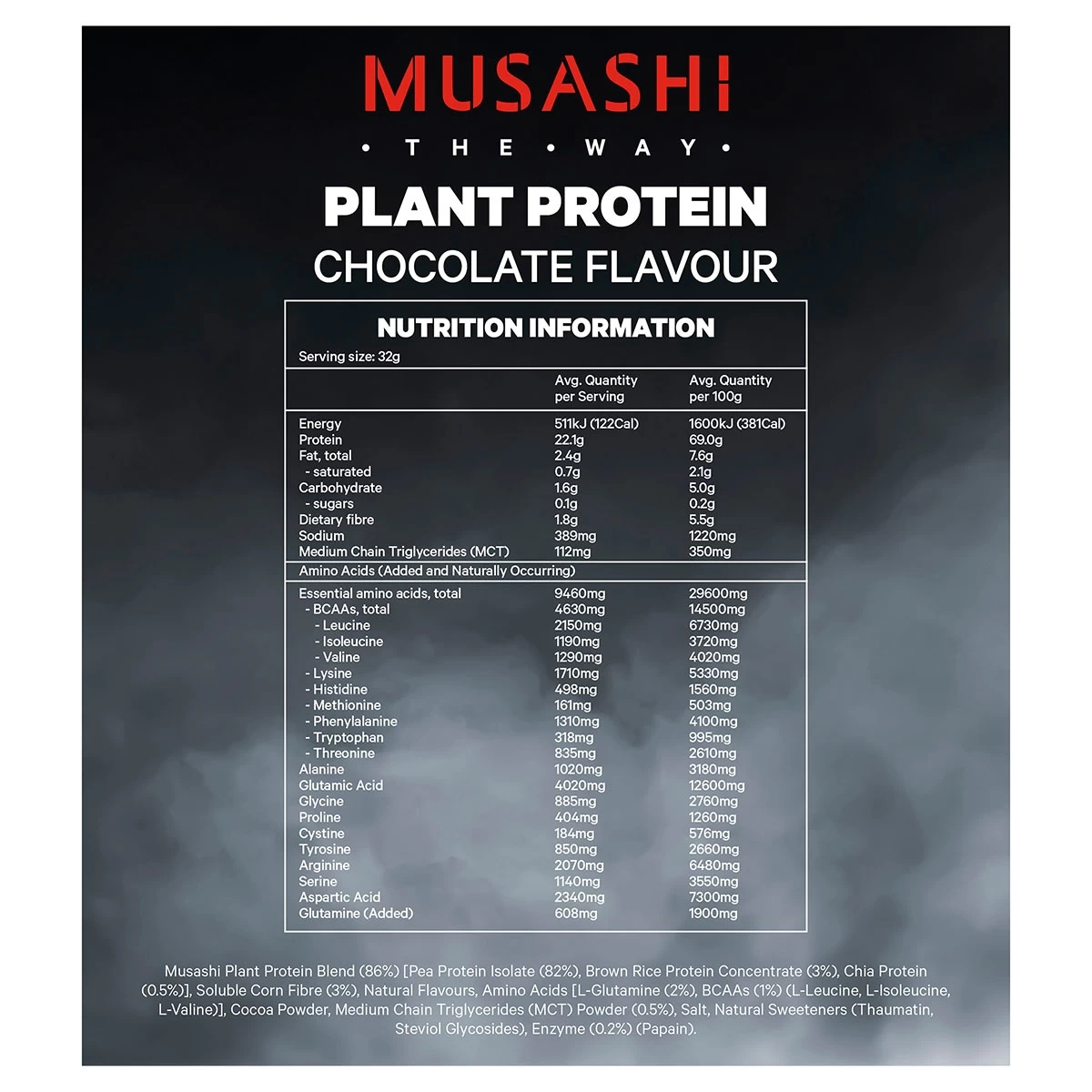Musashi Plant Protein chocolate is a blend of pea, brown rice & chia protein. This vegan-friendly formula has 22g of protein per serve to help with lean muscle & recovery.
