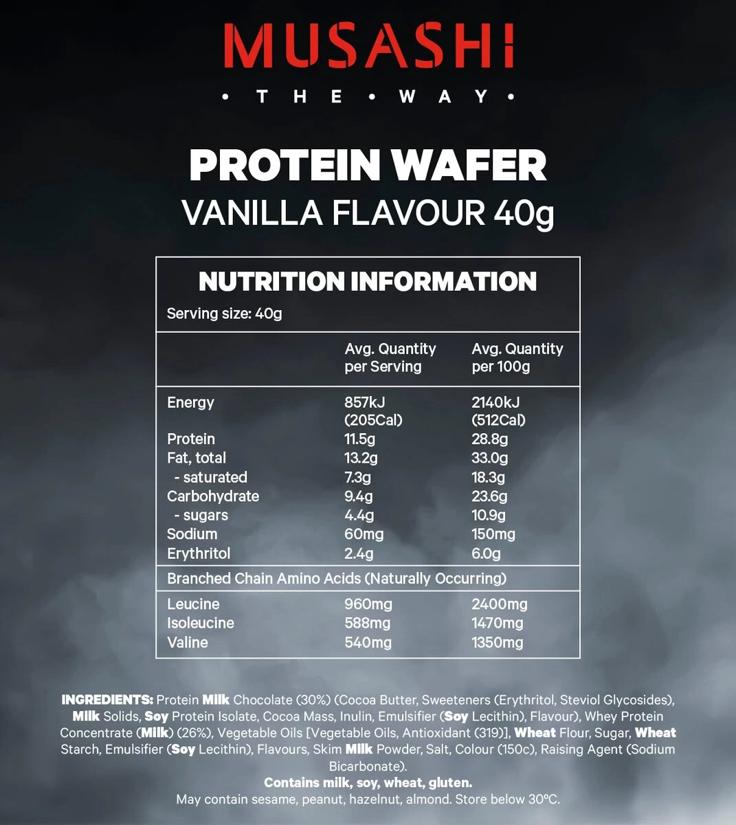 Musashi Vanilla Protein Wafer bars are four layers of crisp wafer layered with a smooth, whey protein concentrate (WPC) protein cream filling and high protein chocolate coating. Great for when you need to fuel your workouts or as a protein hit post-workout.