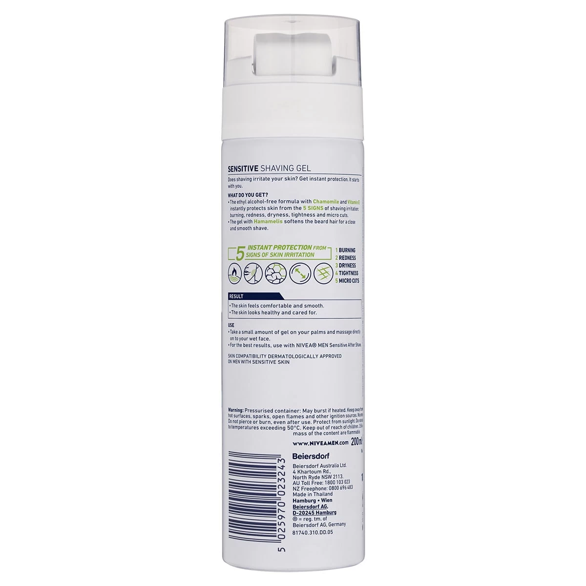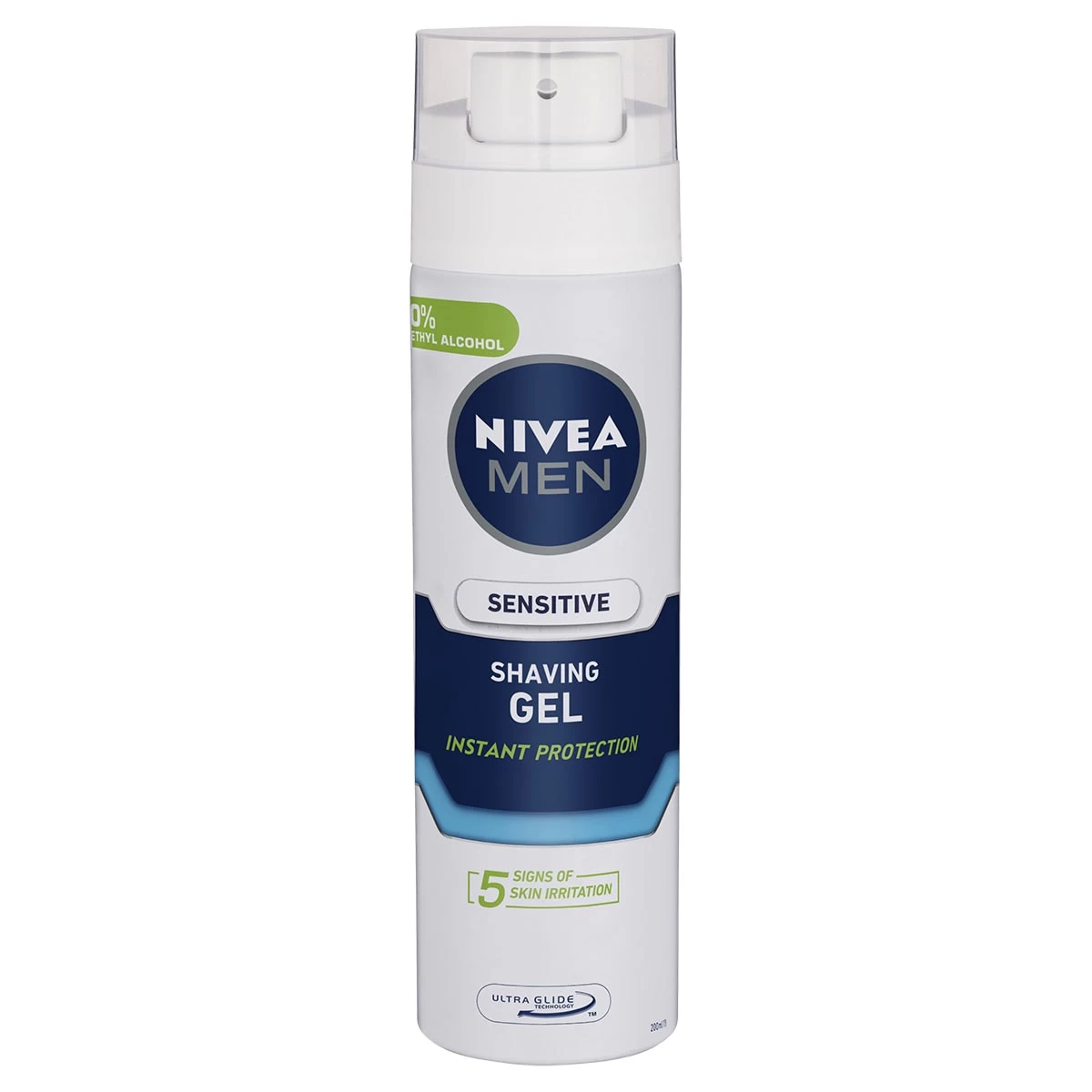 Nivea men’s Sensitive Shaving gel with Chamomile & Vitamin E protects your skin from the 5 signs of shaving irritations: burning, redness, dryness, tightness, micro cuts.