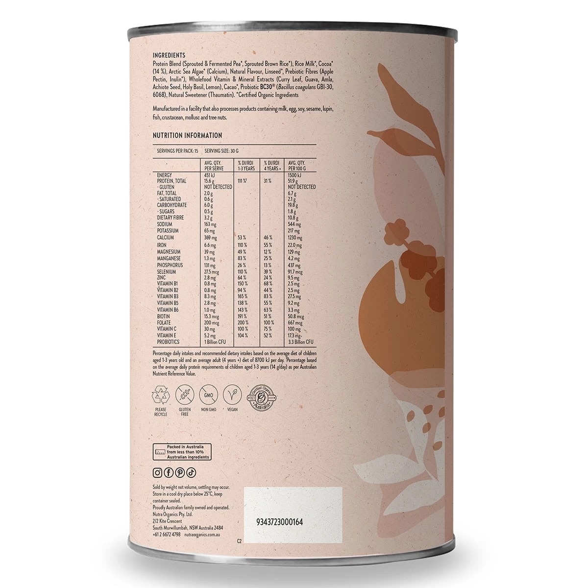 Protein Blend (Sprouted & Fermented Pea*, Sprouted Brown Rice*), Rice Milk*, Cocoa* (14 %), Arctic Sea Algae* (Calcium), Natural Flavour, Linseed*, Prebiotic Fibres (Apple Pectin, Inulin*), Wholefood Vitamin & Mineral Extracts (Curry Leaf, Guava, Amla, Achiote Seed, Holy Basil, Lemon), Cacao*, Probiotic BC30® (Bacillus coagulans GBI-30, 6068), Natural Sweetener (Thaumatin).