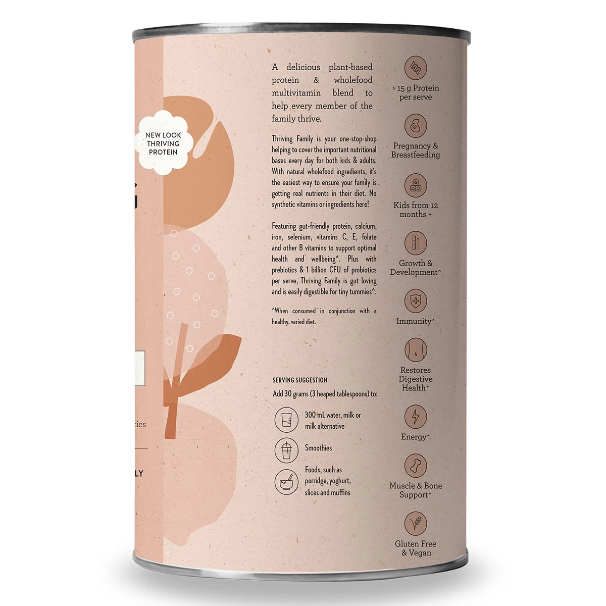 This delicious, blend gives your body a boost of gut friendly protein, calcium, iron, selenium, vitamins C, E, folate and other B vitamins to support optimal health and wellbeing. It helps every member of the family thrive. Thriving Protein is gut loving and is easily digestible by tiny tummies.