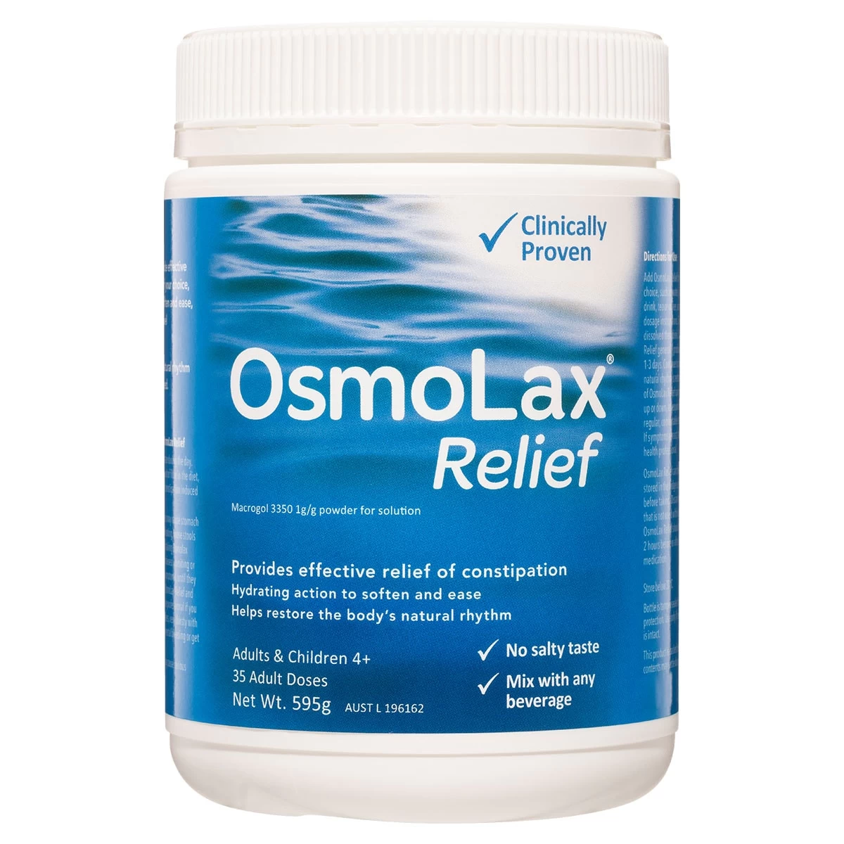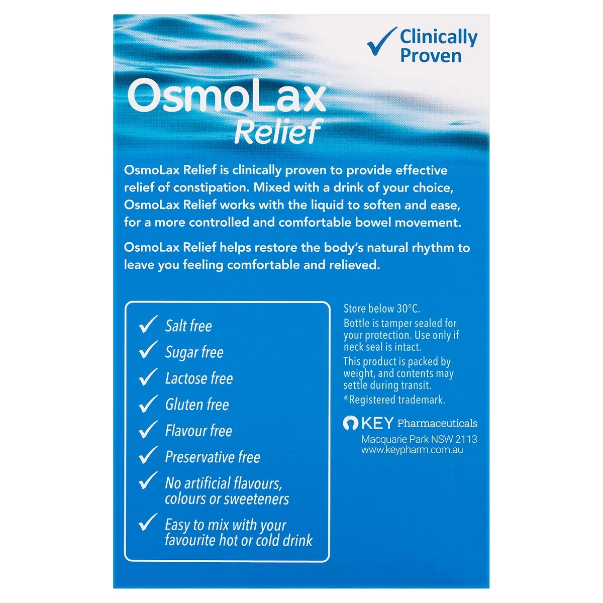 Mixed with water or your favourite drink, OsmoLax Relief works with the liquid to hydrate, soften and ease, for a more controlled and comfortable bowel movement.