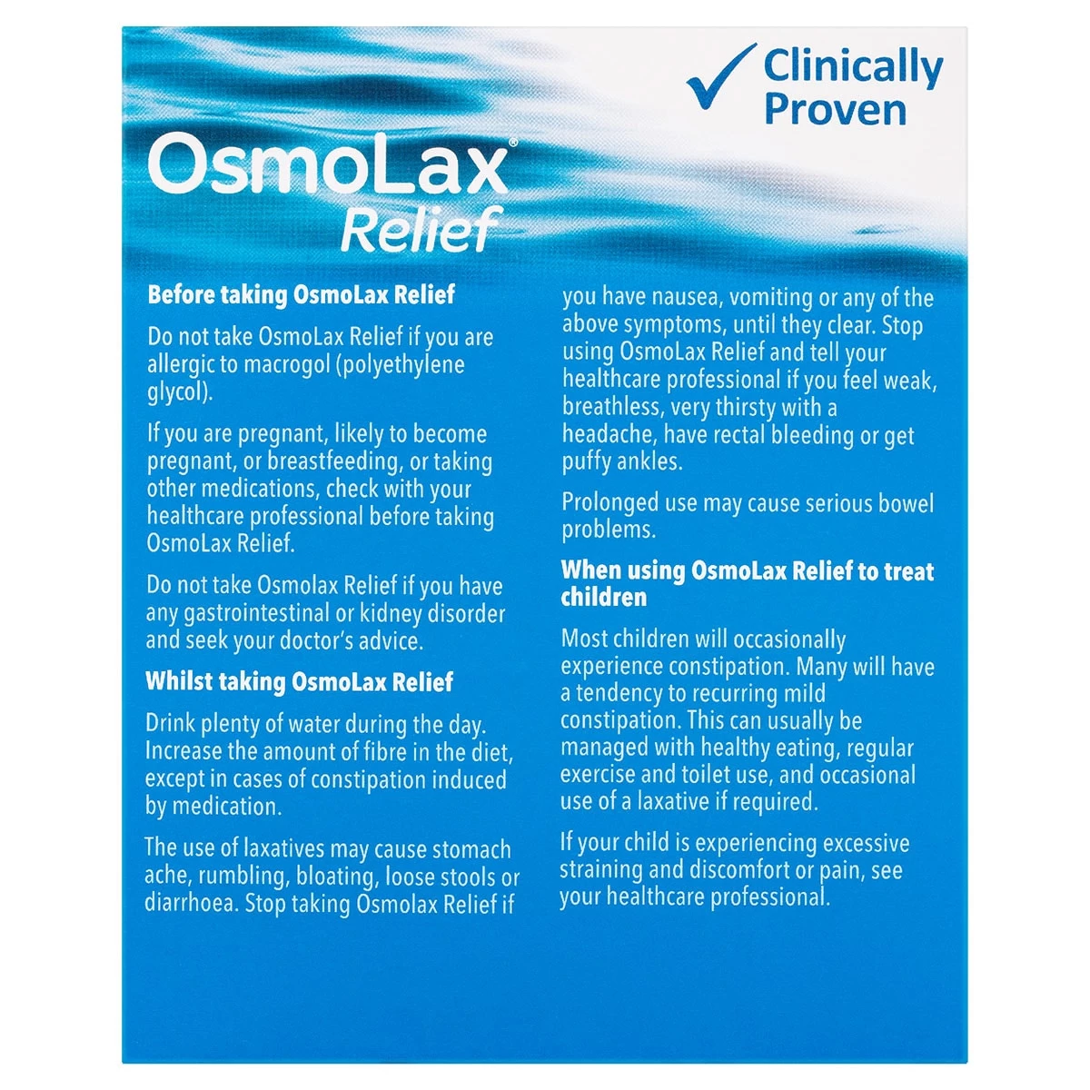 The active ingredient in OsmoLax Relief is called macrogol 3350. Macrogol is considered to be a ‘gold standard’ to assist the treatment of constipation in adults and children.