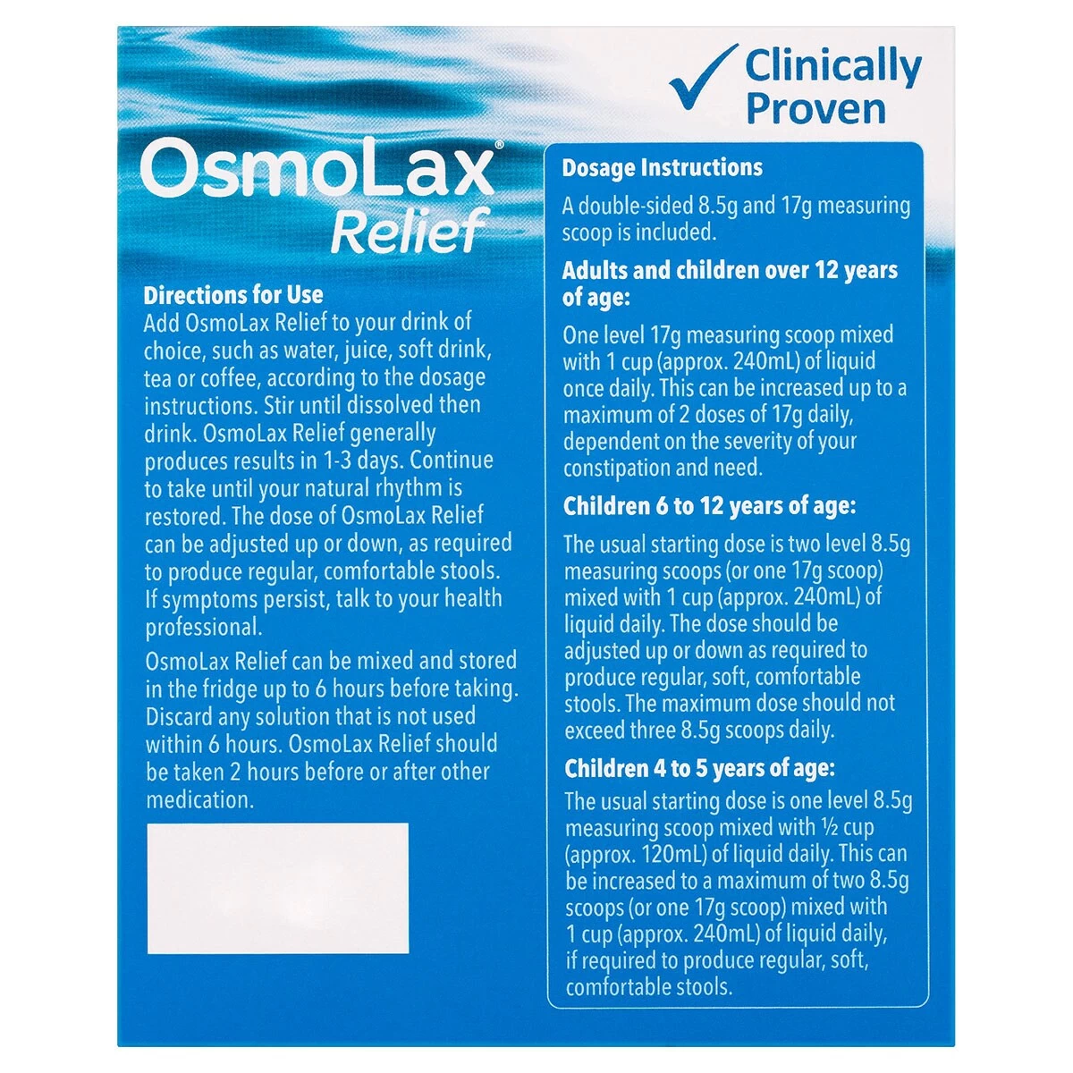Please follow the directions for use and dosage instructions printed on your OsmoLax Relief pack. Your OsmoLax Relief pack contains a measuring scoop, either a double-sided 8.5g/17g scoop, or a single 8.5g scoop, depending on the product purchased.