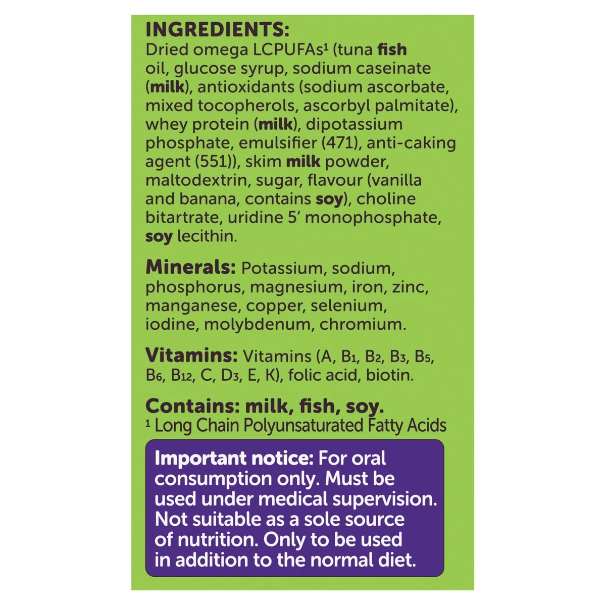 Dried omega LCPUFAs1 (tuna fish oil, glucose syrup, sodium caseinate (milk), antioxidants (sodium ascorbate, mixed tocopherols, ascorbyl palmitate), whey protein (milk), dipotassium phosphate, emulsifier (471), anti-caking agent (551)), skim milk powder, maltodextrin, sugar, flavour (vanilla and banana, contains soy), choline bitartrate, uridine 5‘monophosphate, soy lecithin.