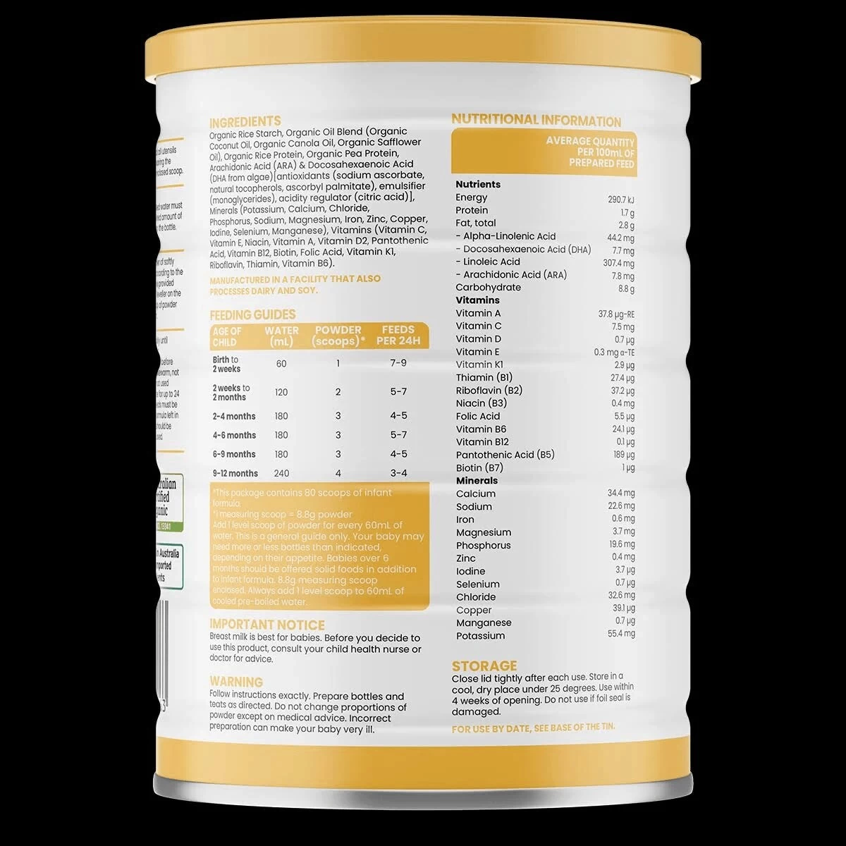 Organic Rice Starch, Organic Oil Blend (Organic Coconut Oil, Organic Canola Oil), Organic Rice Protein, Organic Pea Protein, Arachidonic Acid (ARA), Docosahexaenoic Acid (DHA from algae), Minerals (Potassium, Calcium, Chloride, Phosphorus, Sodium, Magnesium, Iron, Zinc, Copper, Iodine, Selenium, Manganese), Vitamins (Vitamin C, Niacin, Vitamin E, Pantothenic Acid, Vitamin A, Riboflavin, Thiamin, Vitamin B6, Folic Acid, Vitamin K1, Biotin, Vitamin D2, Vitamin B12). Manufactured in a facility that also processes dairy and soy.