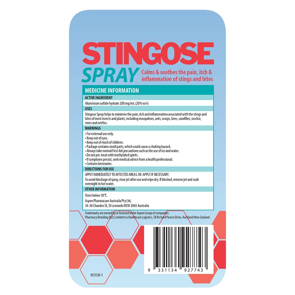 Stingose is a first aid treatment that works rapidly to provide an effective treatment for the pain, itch and inflammation associated with the stings and bites of most insects and plants, including ants, bees, wasps, mosquitoes, sandflies, sea lice, vines, and nettles. Stingose helps to calm and soothe the pain, itch and swelling of stings and bites and may help prevent further reaction, infection, and long-term scarring. The active ingredient, aluminium sulfate, acts to denature (inactivate) the venom found in a range of stings and bites. After prompt application to the skin, Stingose relieves pain and minimises the after-effects of inflammation and blistering from stings and bites.