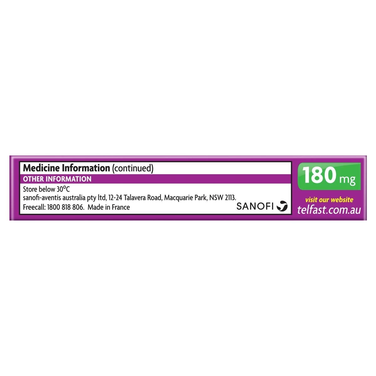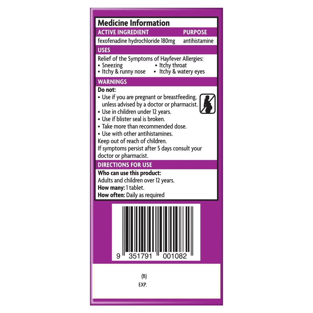 Active Ingredients: Fexofenadine Hydrochloride 180mg Inactive Ingredients: croscarmellose sodium, pregelatinised maize starch, microcrystalline cellulose, magnesium stearate, hypromellose, povidone, titanium dioxide, colloidal anhydrous silica, macrogol 400, Pigment Blend Pink PB1254 (ARTG PI No.3225) and Pigment Blend Yellow PB1255 (ARTG PI No.3226).