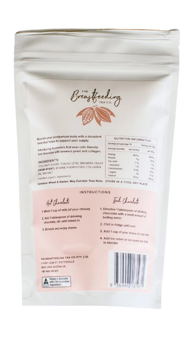 Australia’s first Lactation Hot Chocolate with nourishing collagen peptides to support hair, skin, and bones. May support stretch mark prevention, skin hydration and elasticity, bones strength, postpartum tissue repair, wound healing, and postpartum hair loss.