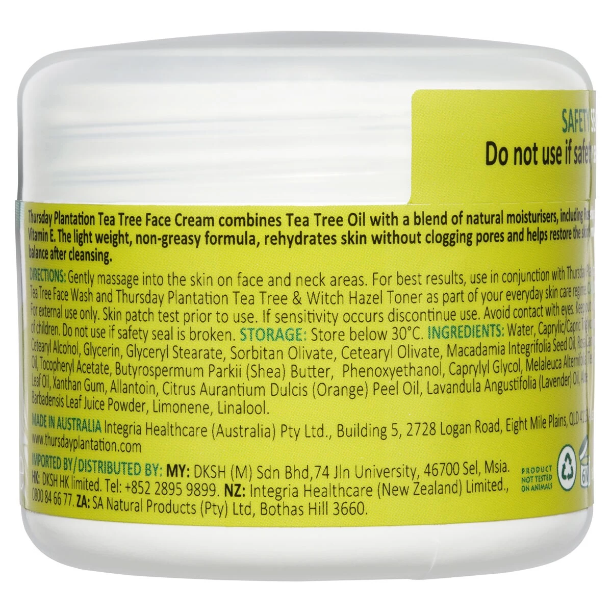 Thursday Plantation Tea Tree Face Cream, is light, non-greasy & hydrates skin without clogging pores. It helps restore the skin’s moisture balance after cleansing & toning. It is an easily absorbed formula that leaves no oily residue and is suitable for all skin types.